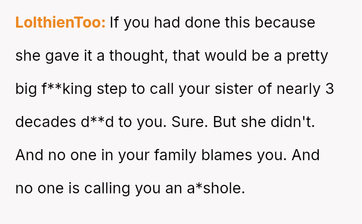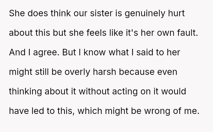The OP is now questioning if her strong reaction and subsequent harshness toward her sister were justified.