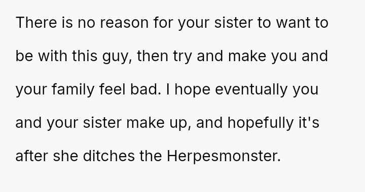 Given the severity of the ex-partner's past actions—which included deliberate concealment of an STD that carried fertility risks—was the OP's decision to instantly sever ties with her sister the right choice to uphold personal boundaries, or was it an overly harsh response that unfairly punished the sister for dating someone who the OP believes cannot be redeemed?