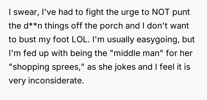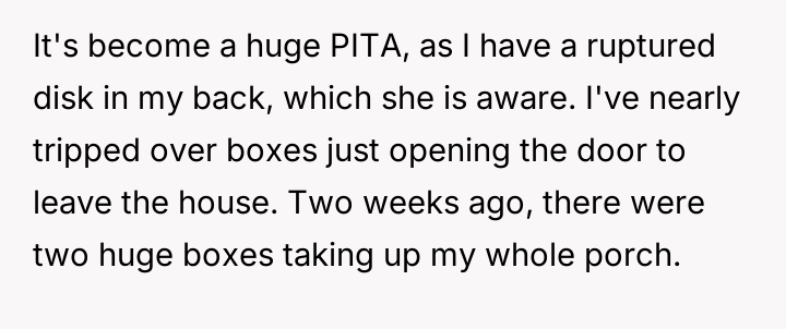 The original poster (OP) is clearly frustrated, feeling taken advantage of due to the excessive volume of packages delivered to their shared mailbox area, which is now creating a physical hazard and significant inconvenience, especially given their back injury.