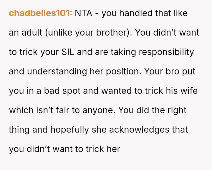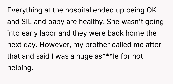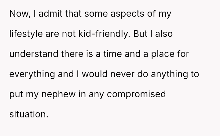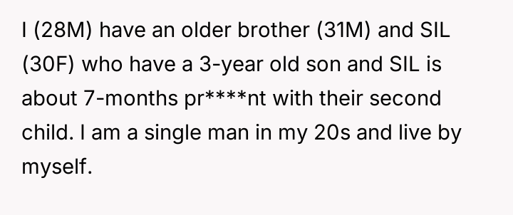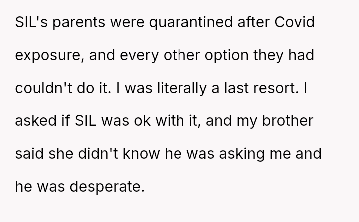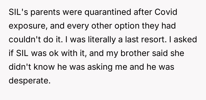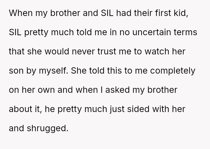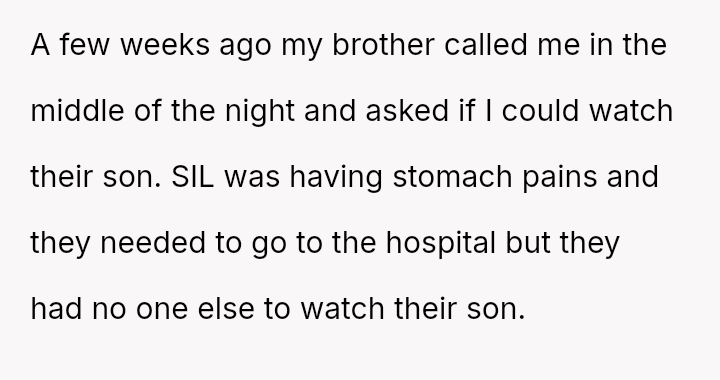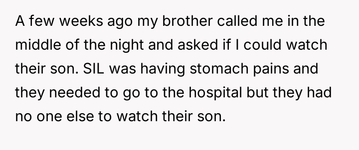 The original poster (OP) faced an emergency situation where his brother and sister-in-law needed urgent childcare, directly contradicting the sister-in-law's long-standing distrust of his lifestyle.
