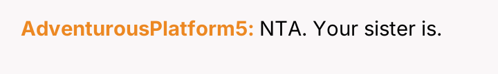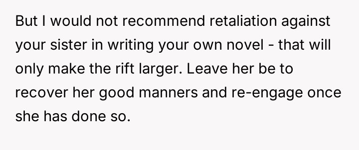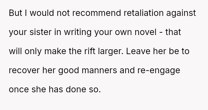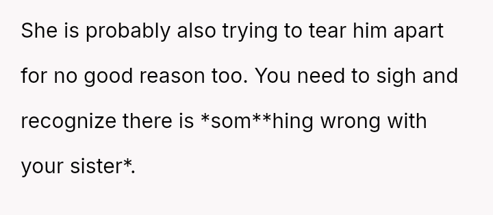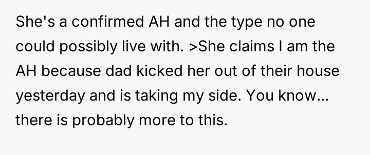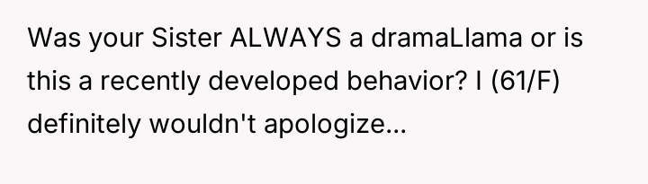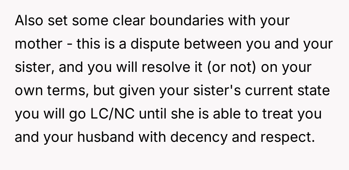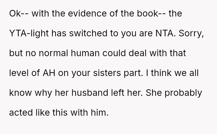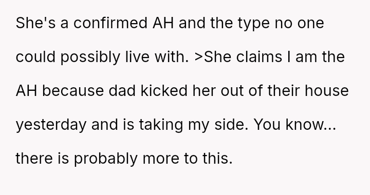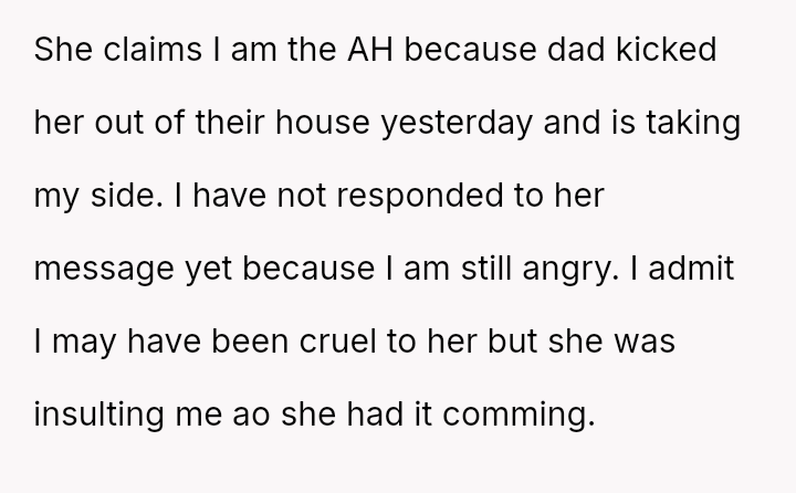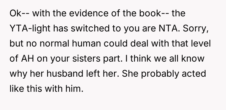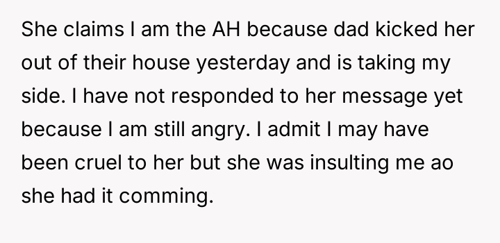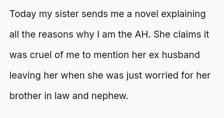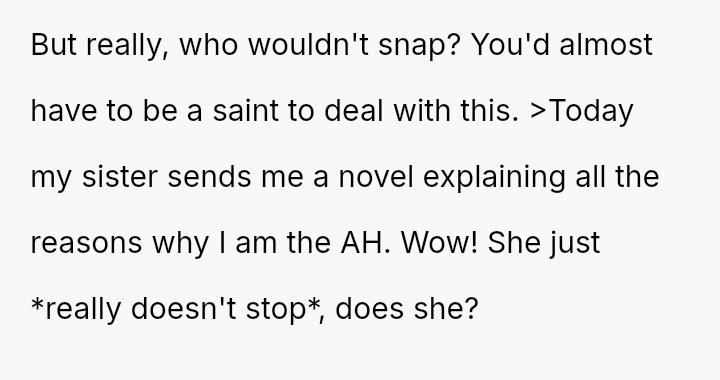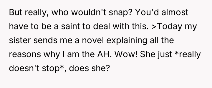 Now, the sister is sending long messages claiming the narrator is the sole problem (AH), leaving the narrator angry and unsure how to proceed.