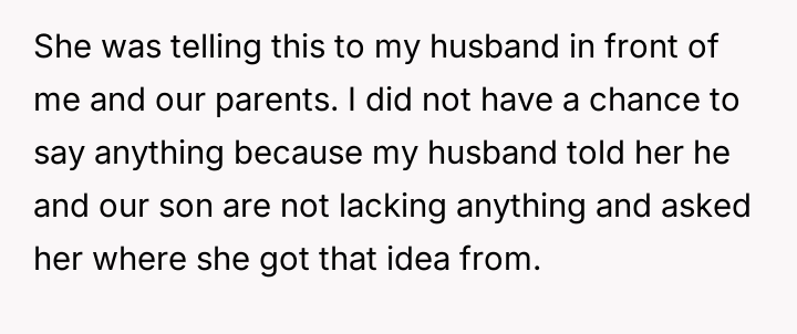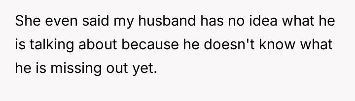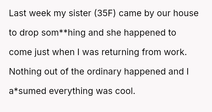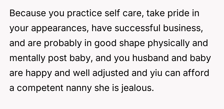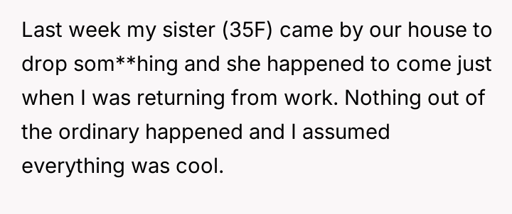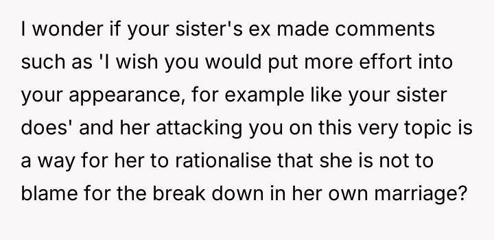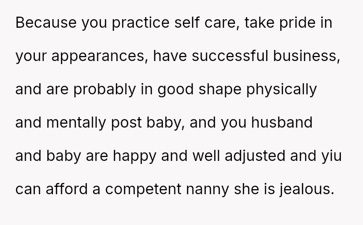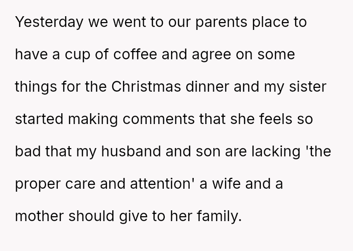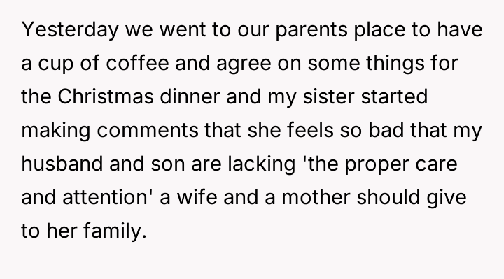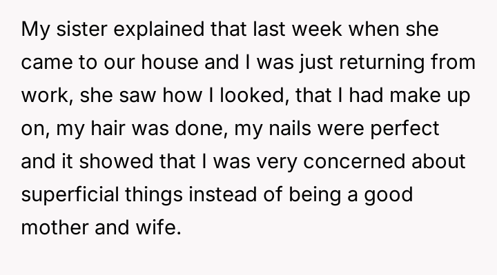 During a recent visit to her parents' home, the narrator's sister began criticizing her marriage and parenting choices, suggesting that the narrator's concern for her appearance (makeup, hair, nails) meant she was not providing the 'proper care and attention' required of a mother and wife.