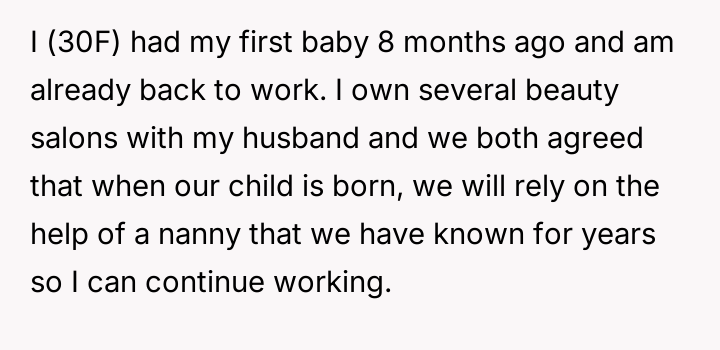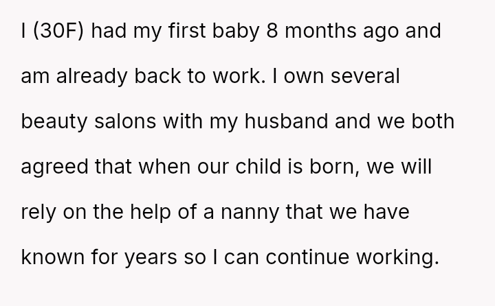 The narrator, a 30-year-old mother who returned to work eight months after having her first baby, runs several beauty salons with her husband.