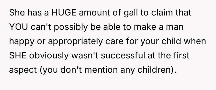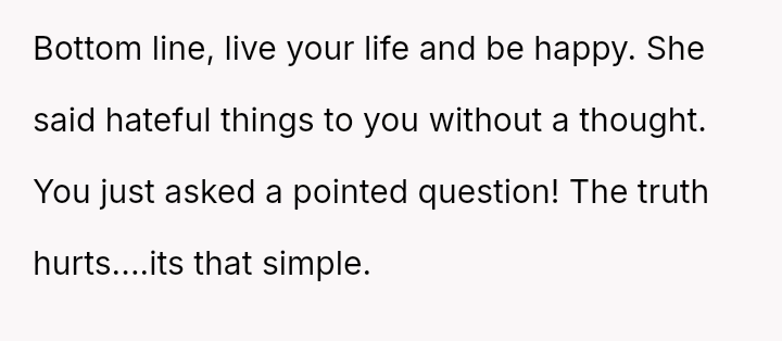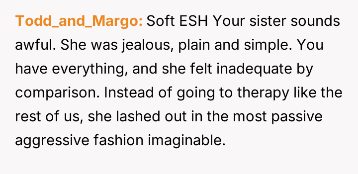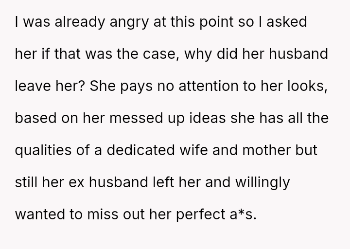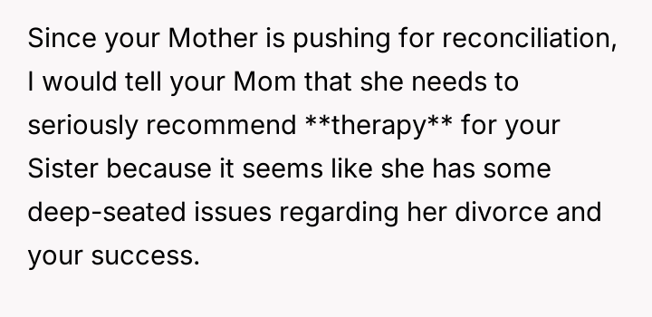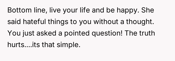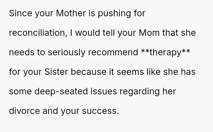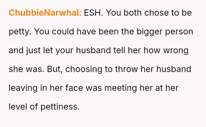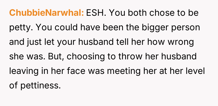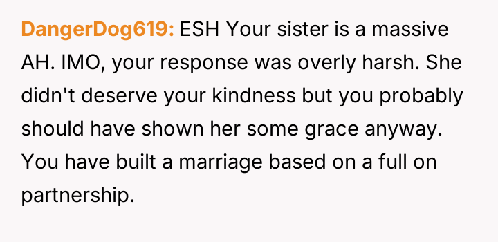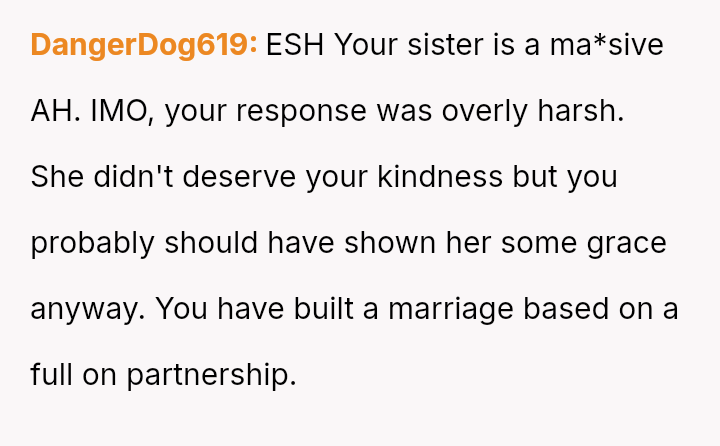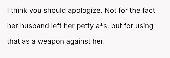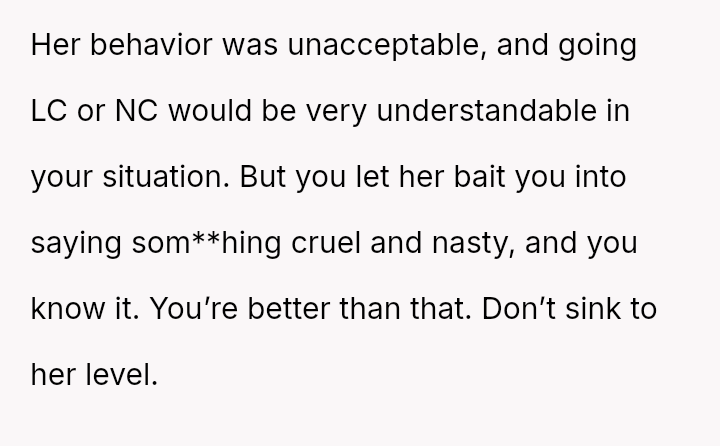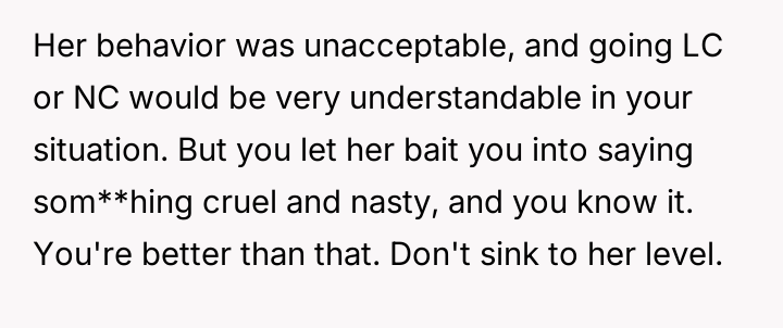While the OP admits her final response—bringing up the sister's divorce—was cruel, she feels it was a justified reaction to the public and deeply personal insults she received.
