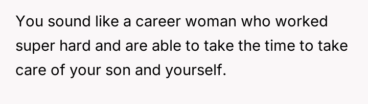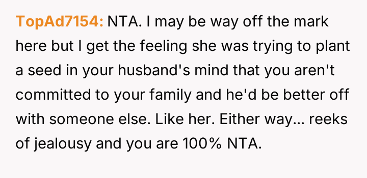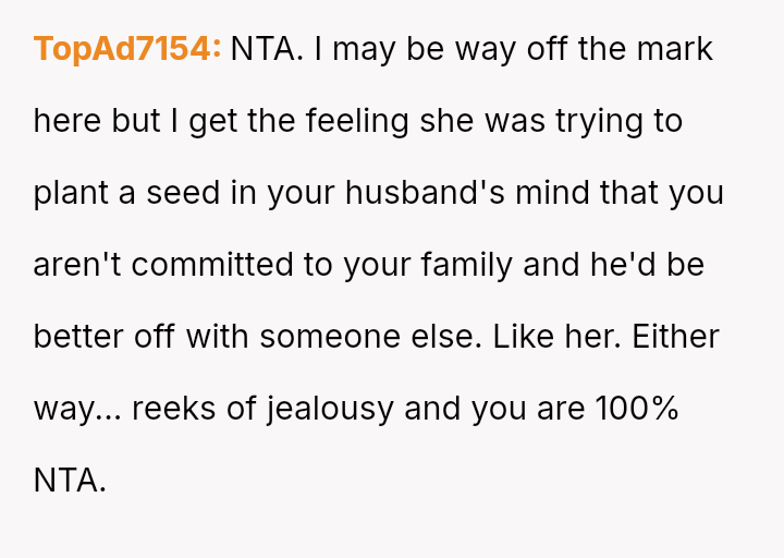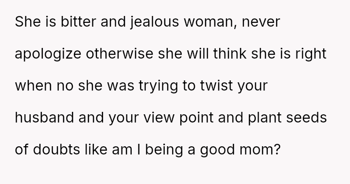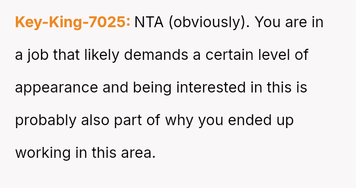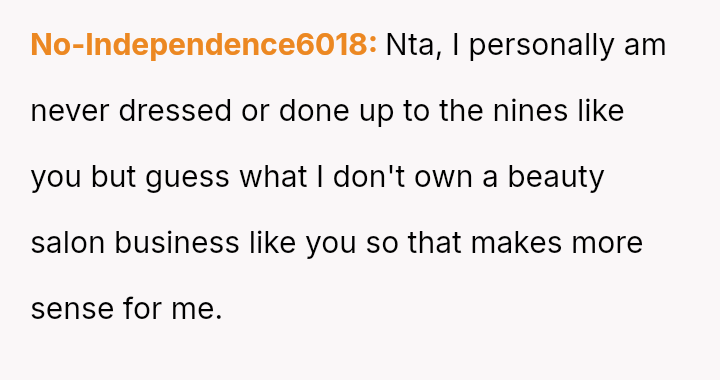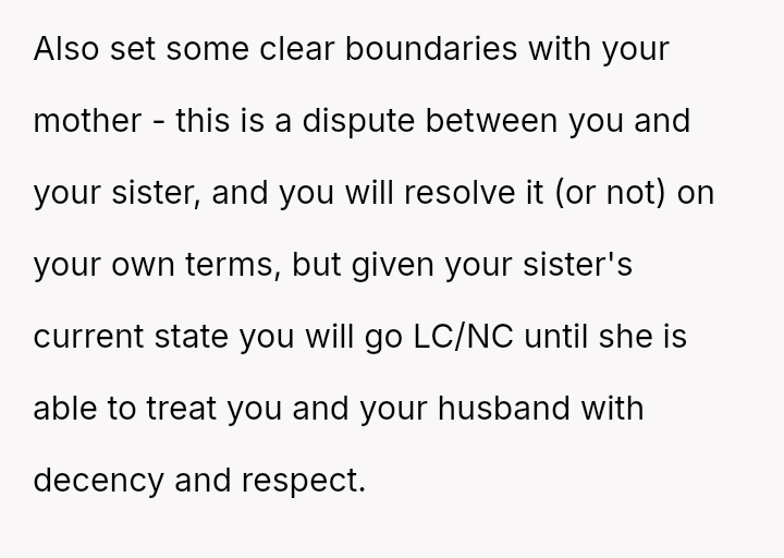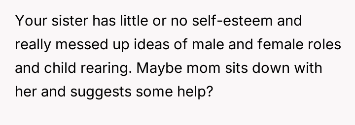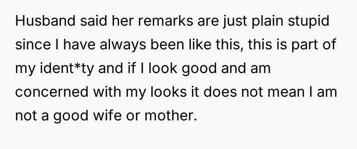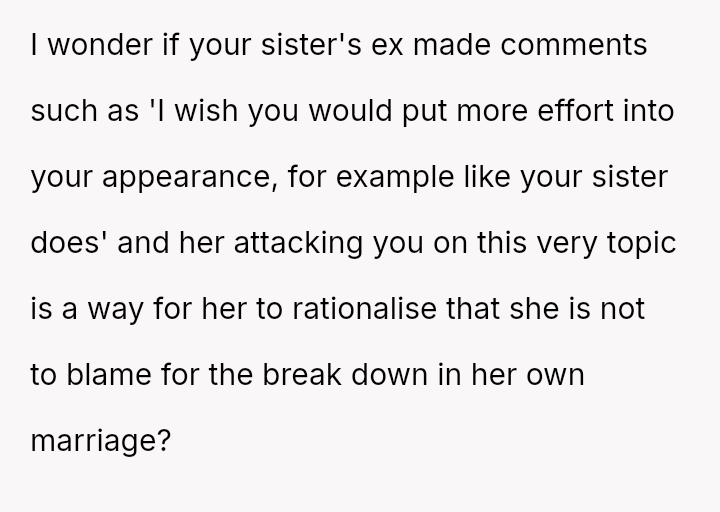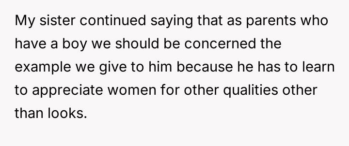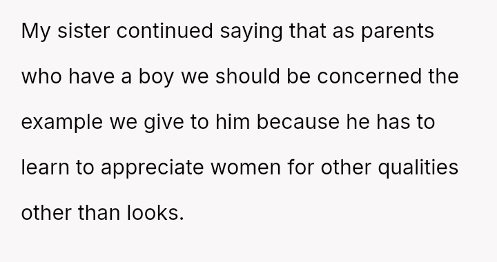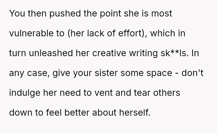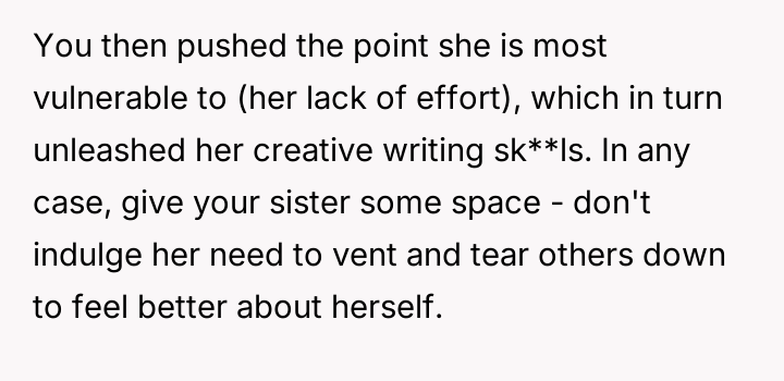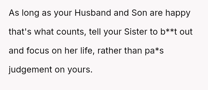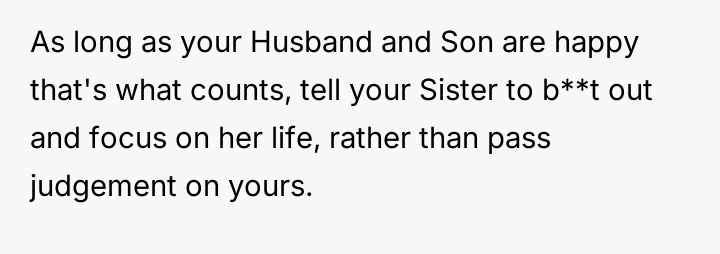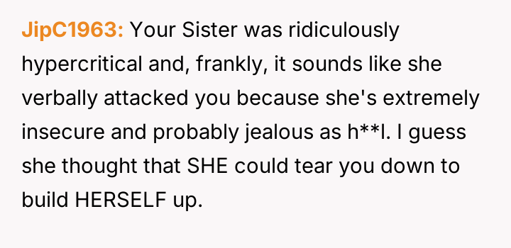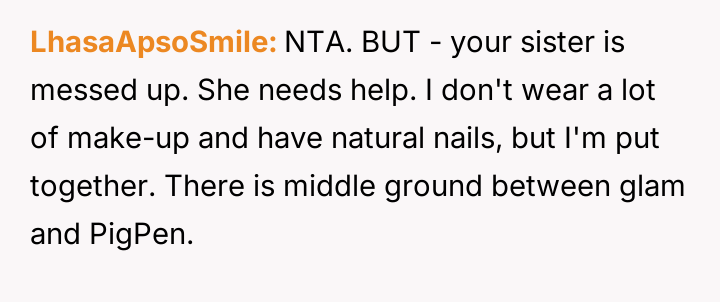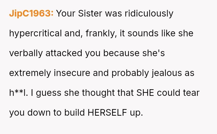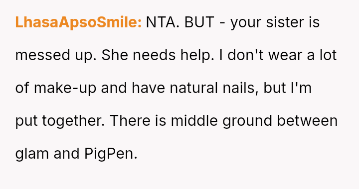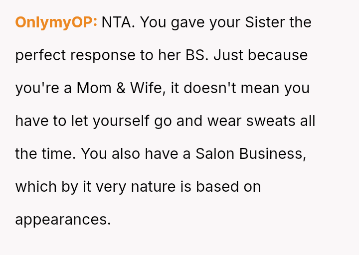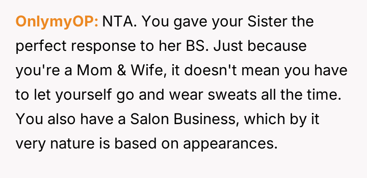 The original poster (OP) finds herself in a conflict stemming from her sister's unso***ited and harsh judgment regarding her choices as a working mother and her focus on appearance.