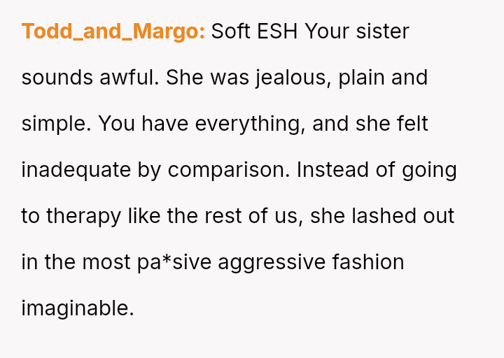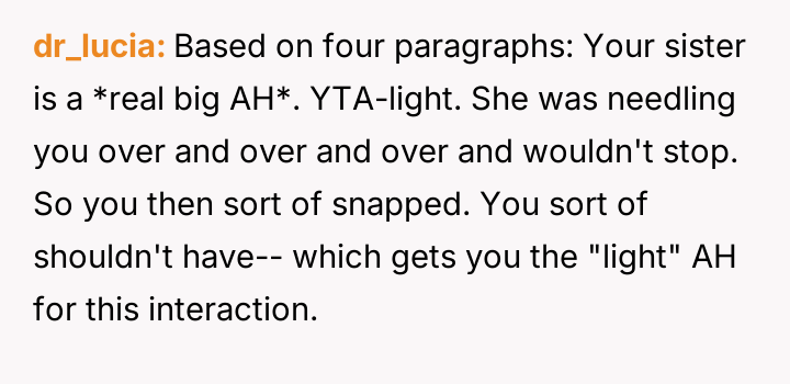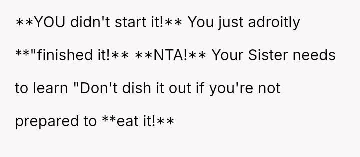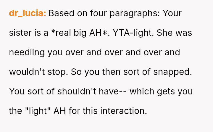 Readers must weigh the boundary v***ation and insult committed by the sister against the severity of the OP's counter-attack and subsequent family fallout.