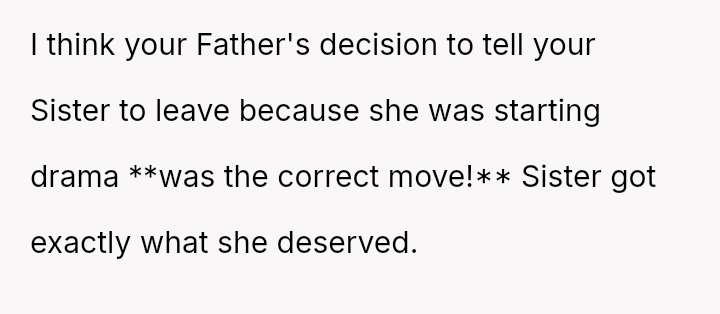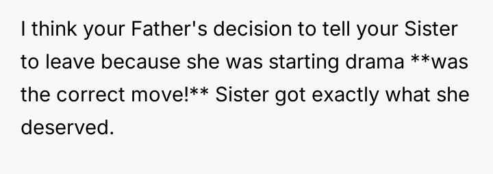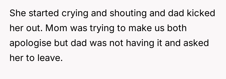When the narrator became angry at the public criticism, she retorted by bringing up the sister's divorce, leading to a major argument where the sister was ultimately asked to leave by their father.