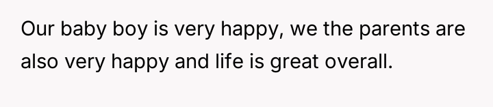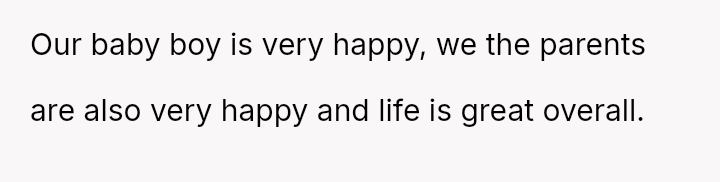 They agreed to rely on a long-time nanny so the narrator could continue her career, and generally, life has been reported as very positive for the parents and their baby.