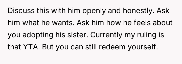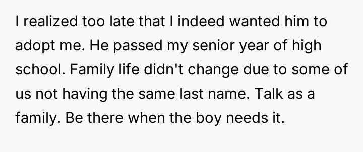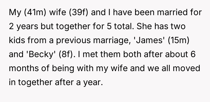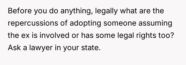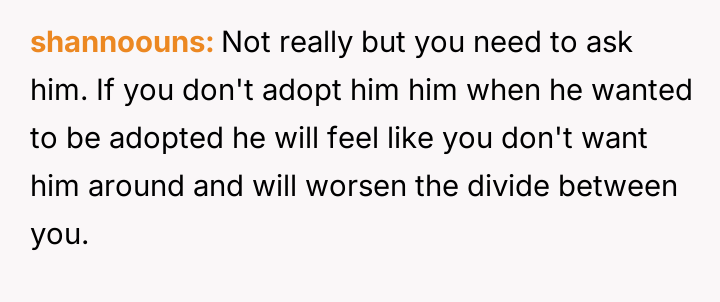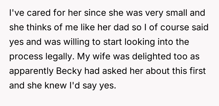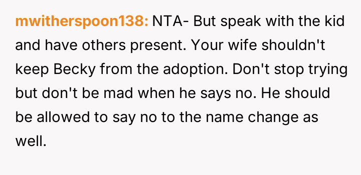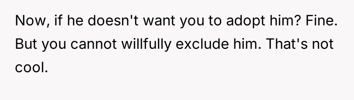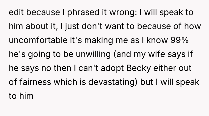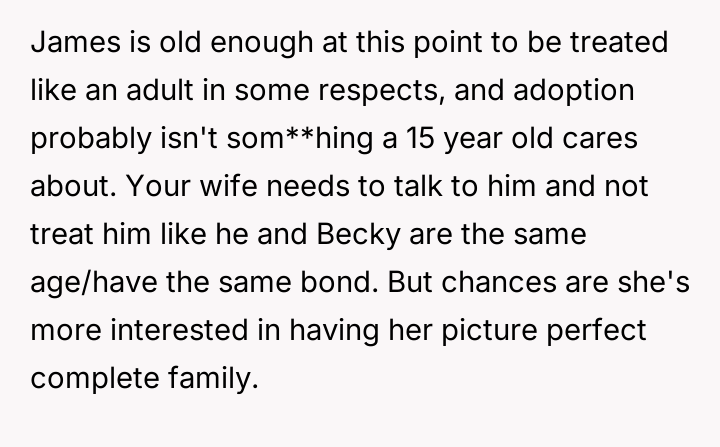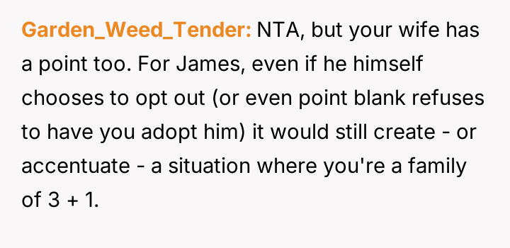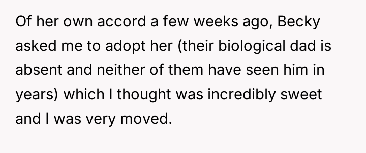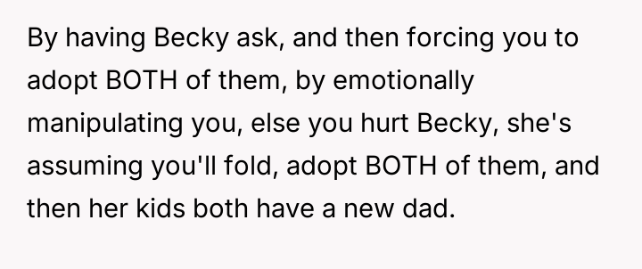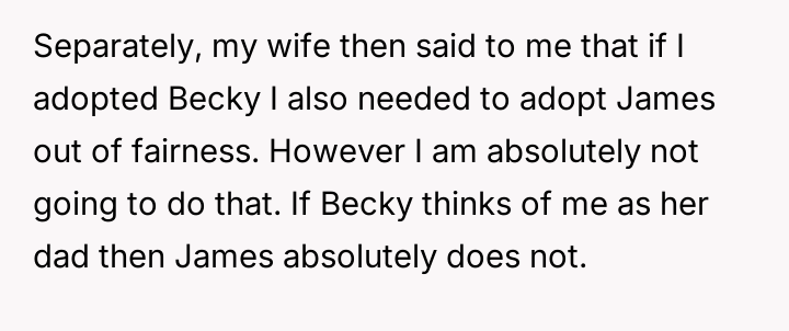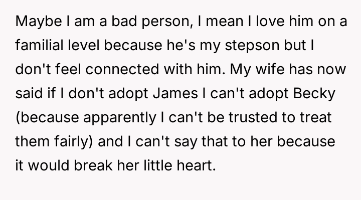 The original poster (OP) finds himself in a difficult situation where his desire to legally formalize his relationship with one stepdaughter, Becky, is being conditionalized by his wife, who insists he must also adopt her older son, James.