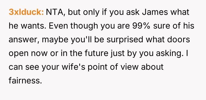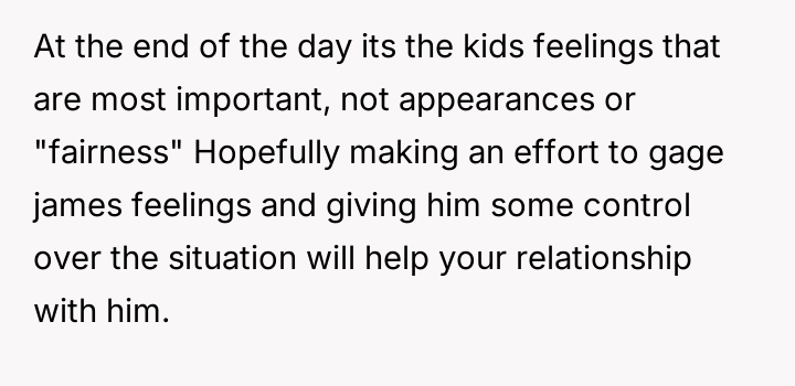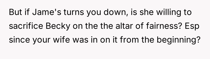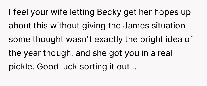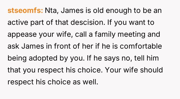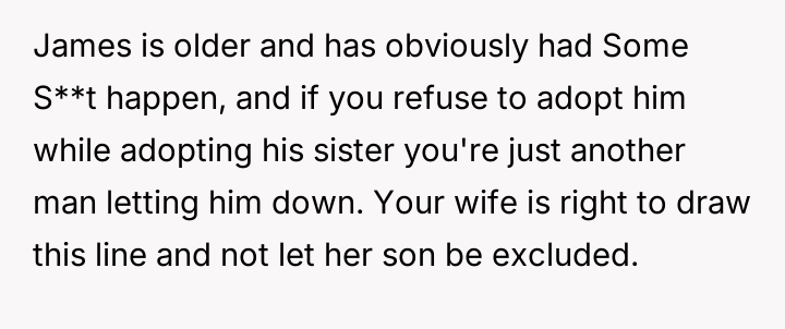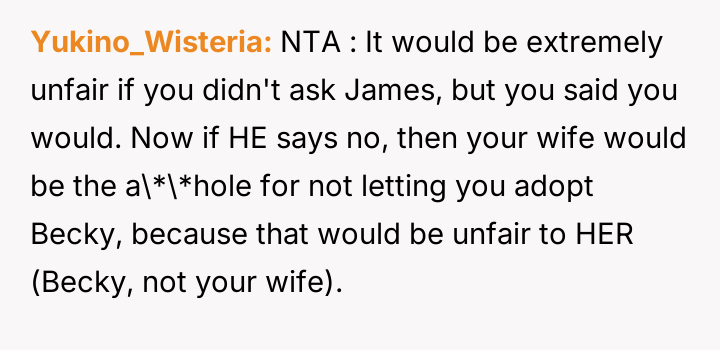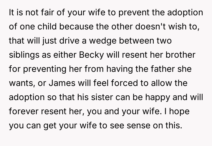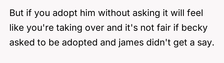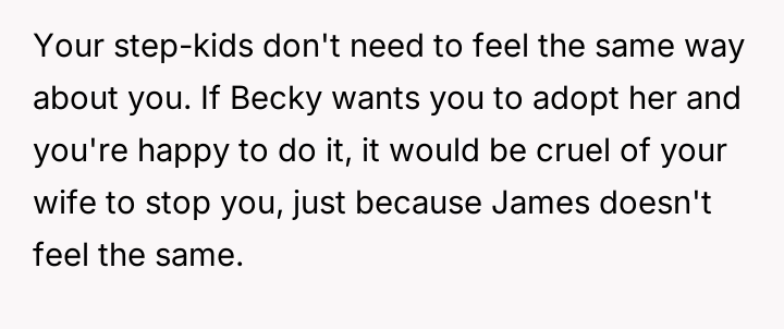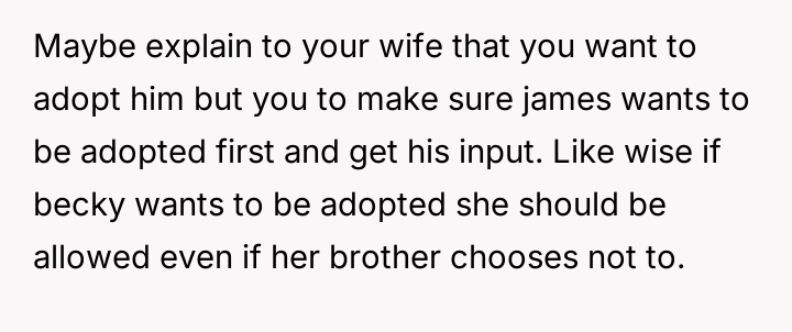 Given the wife's ultimatum—no adoption for Becky unless James is also adopted—the core question remains: Should the OP proceed with offering adoption to James solely to secure the adoption of Becky, or is it ethically sound to refuse an adoption where a genuine parental bond does not exist, even if it means sacrificing the adoption of the child who actively wants it?