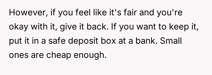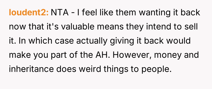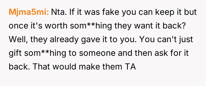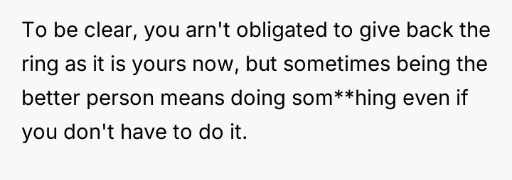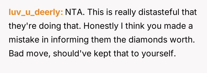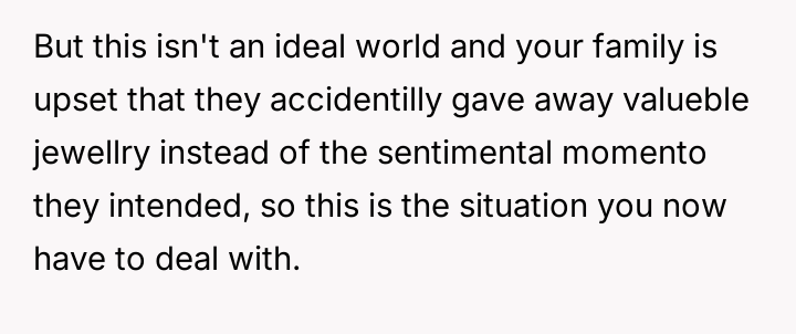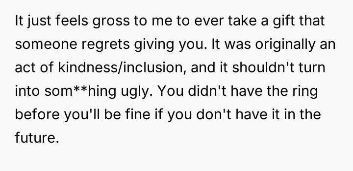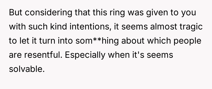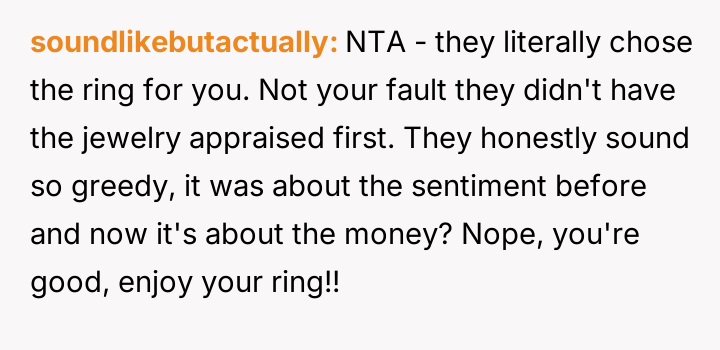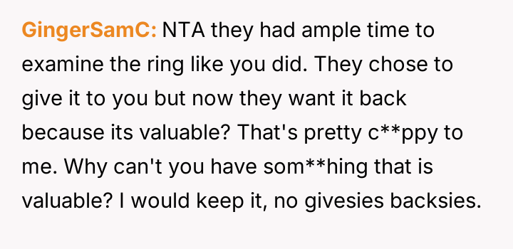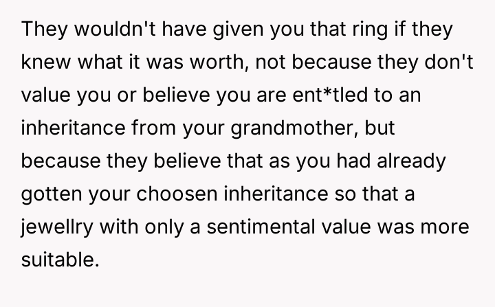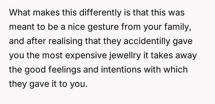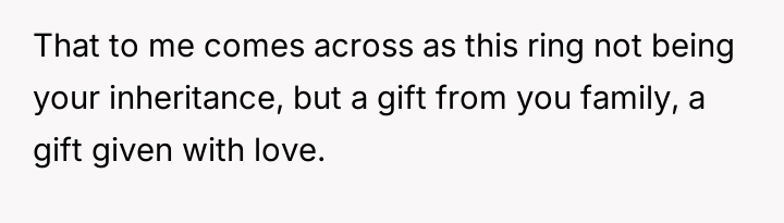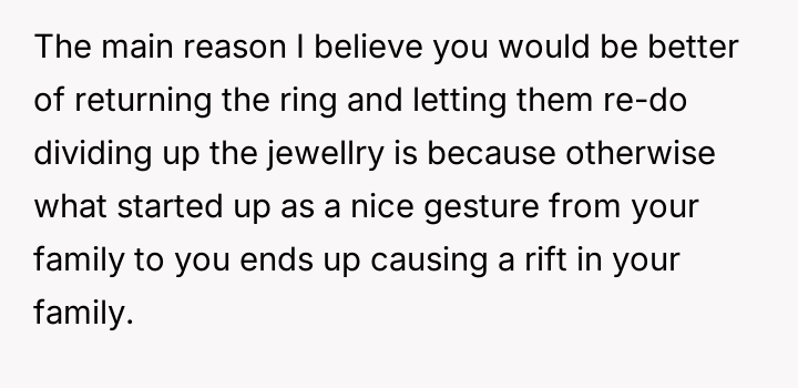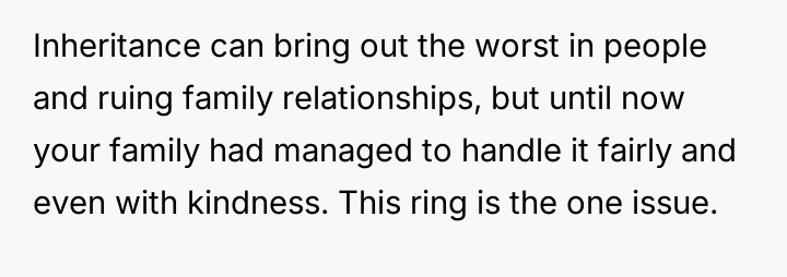 The original poster (OP) is facing a conflict because the family wants to redistribute inherited jewelry after discovering that the ring they gifted the OP has significant monetary value.