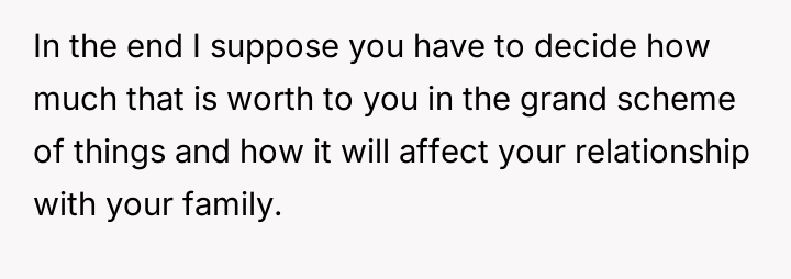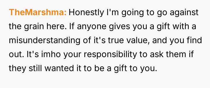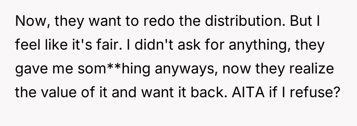 If the family insists on reopening the distribution based on the ring's actual value, should the OP uphold their initial position based on the spirit of the gift and their non-participation in the main selection, or should they agree to a recount to ensure equitable value distribution among all inheritors?