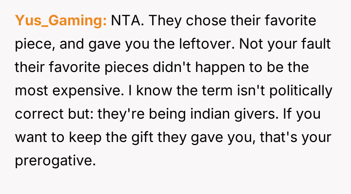 The OP feels resistant to this redistribution because they initially deferred from the main selection process as requested, and the family voluntarily chose the item for them, making them feel the arrangement is now fair.