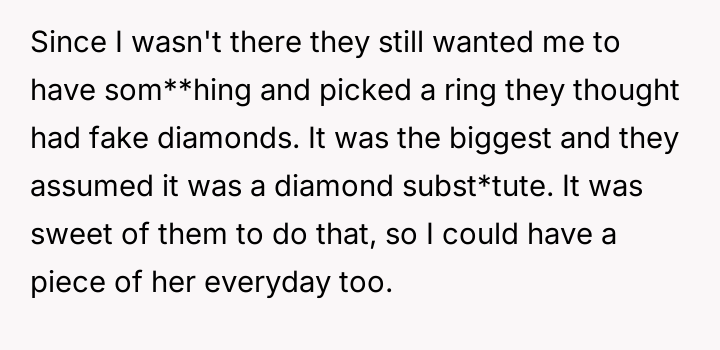 Even from afar, the granddaughter received a ring, believed to hold only a fake diamond, but truly shining with the thoughtfulness and care of those who wanted her to carry a piece of their grandmother’s heart every day.