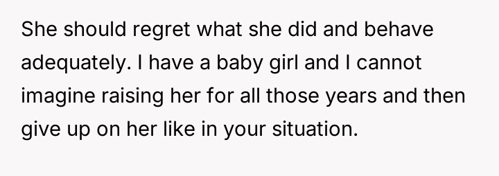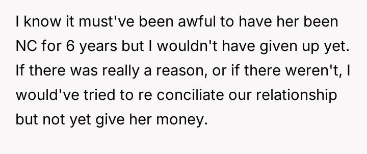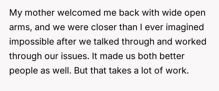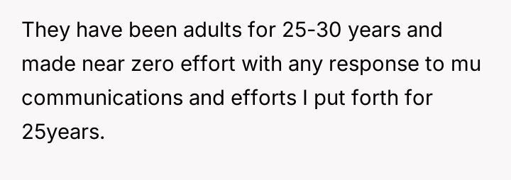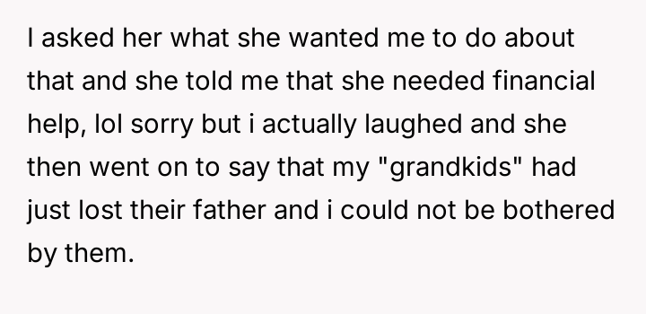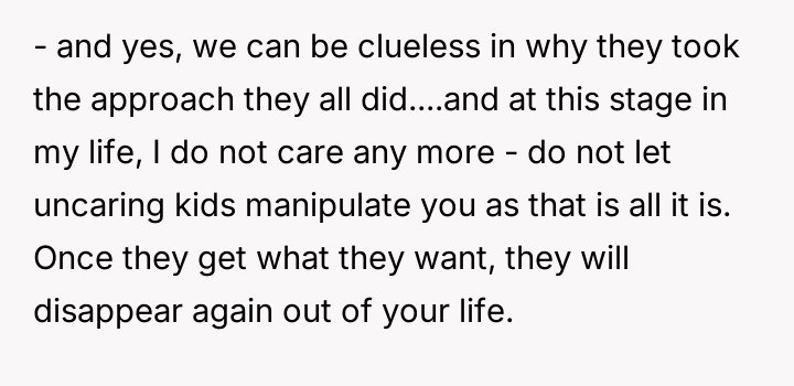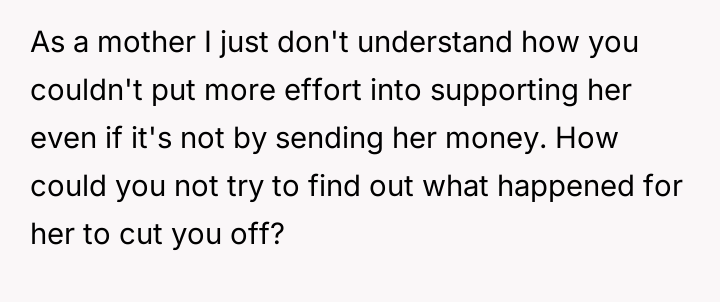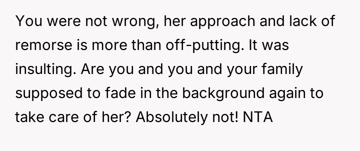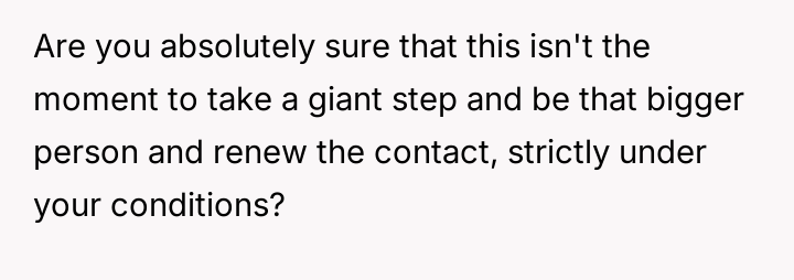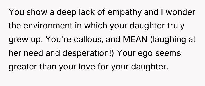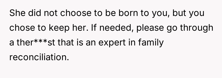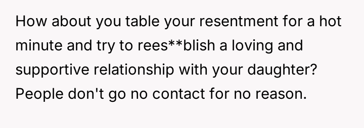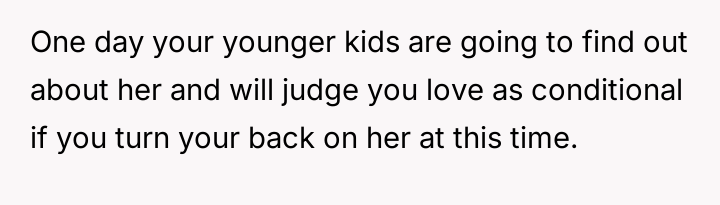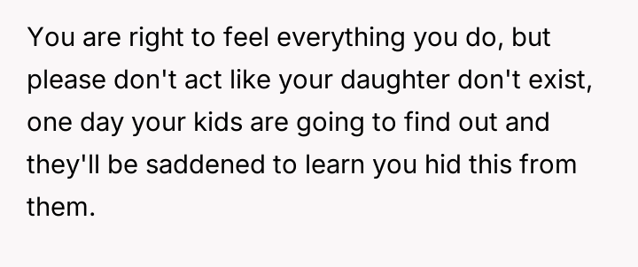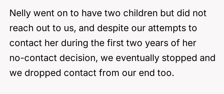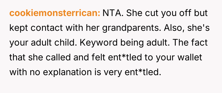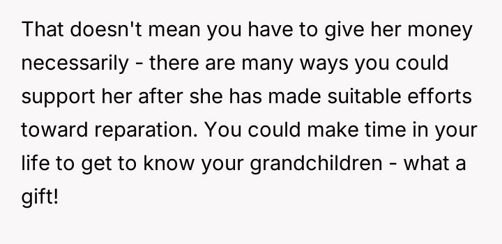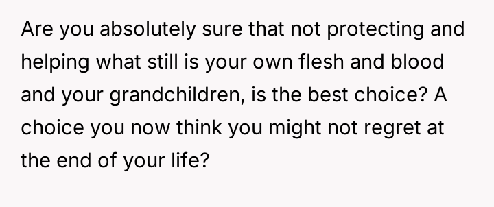 Given the daughter's unilateral decision to sever ties and her subsequent transactional demand for assistance regarding children she kept secret, the central question remains: Does a biological relationship mandate immediate forgiveness and financial support, even when one party has demonstrated a consistent pattern of dismissive and exclusionary behavior toward the other?