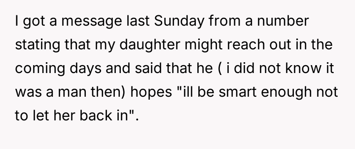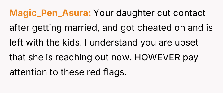The original poster (OP) is dealing with a sudden re-entry request from a daughter who initiated a six-year period of no contact without explanation.