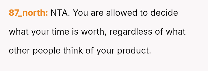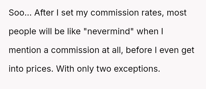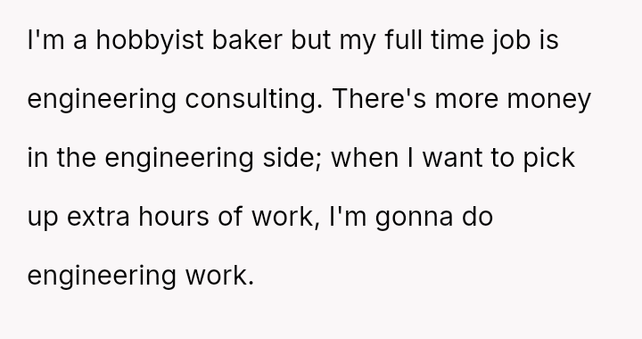 In response to this demand, the OP implemented a high-rate commission structure designed to make taking on baking jobs comparable in value to their engineering work, leading to significant pushback and accusations of being greedy or taking advantage.