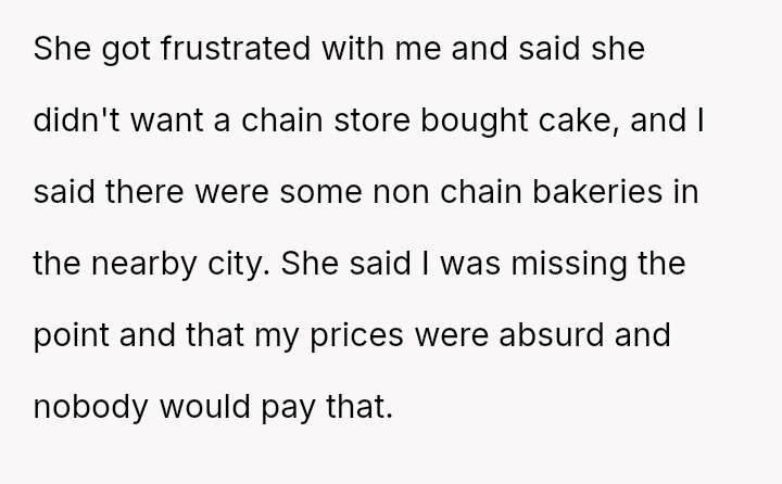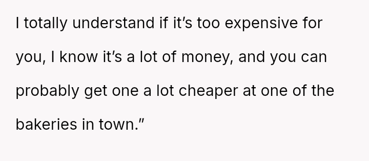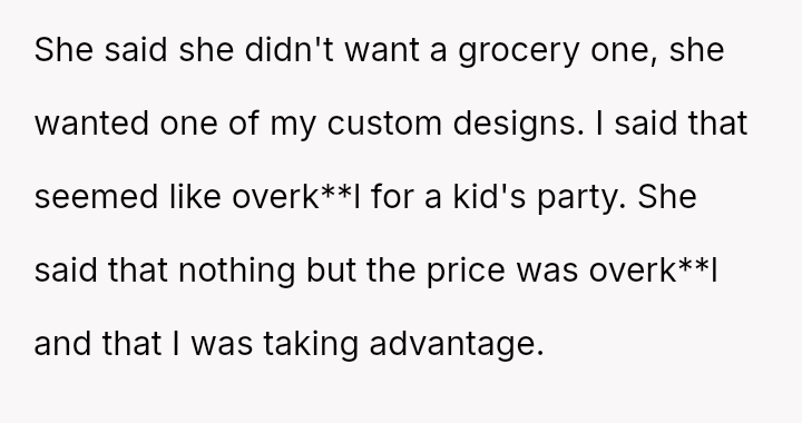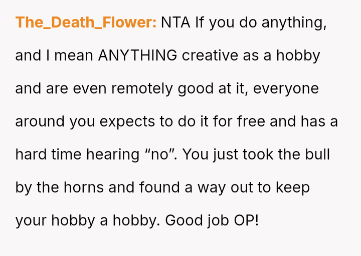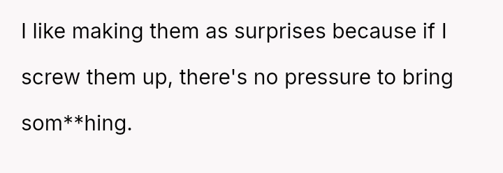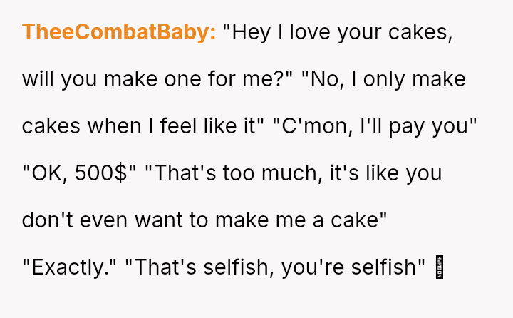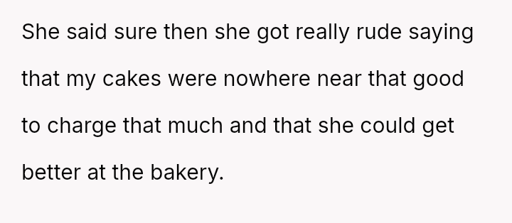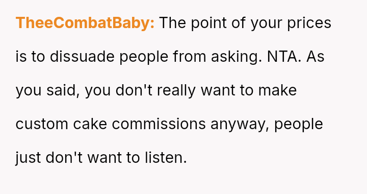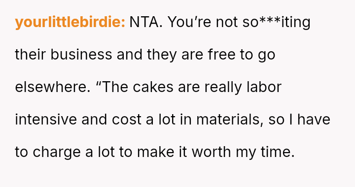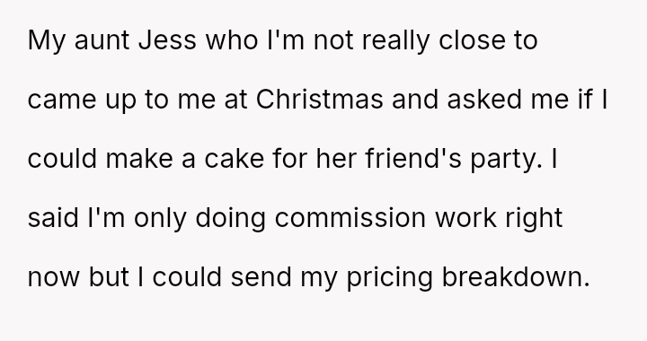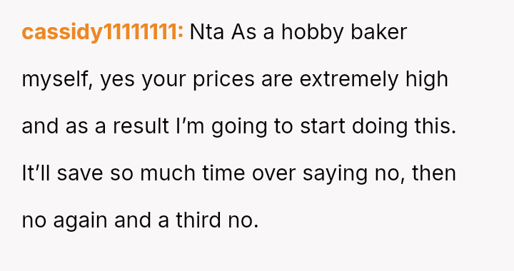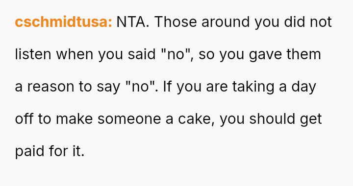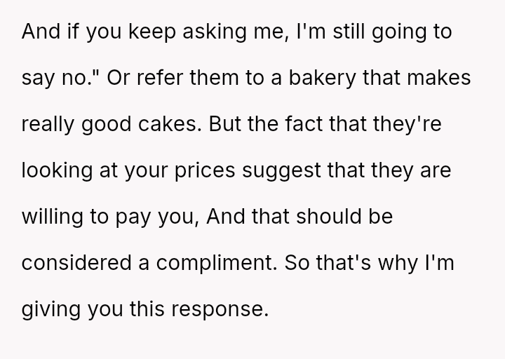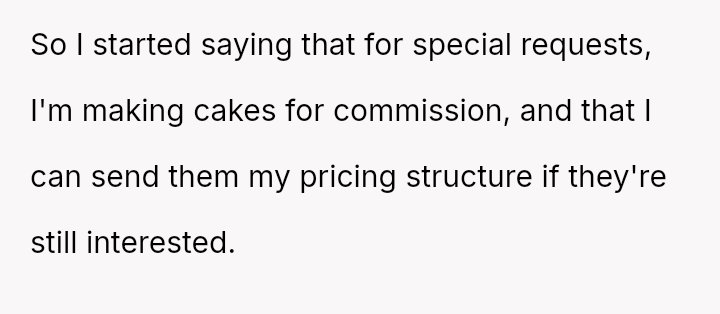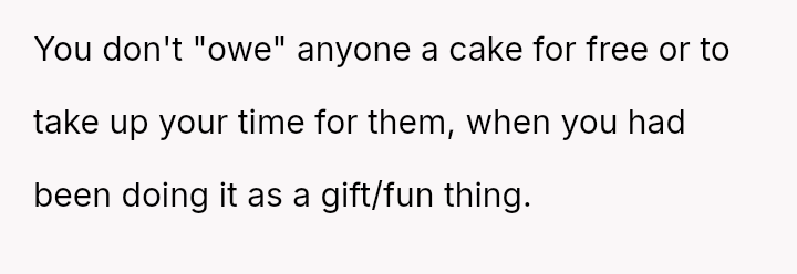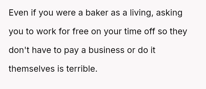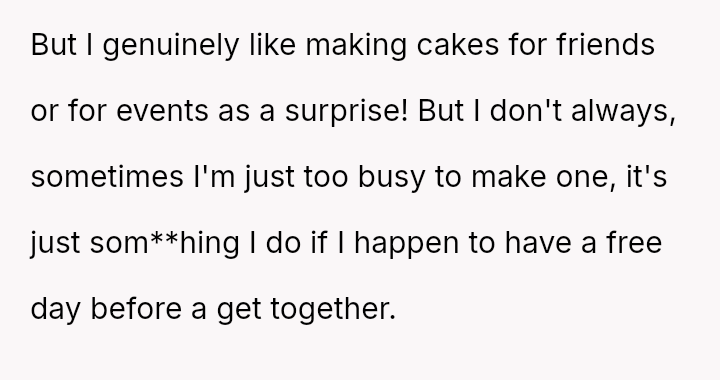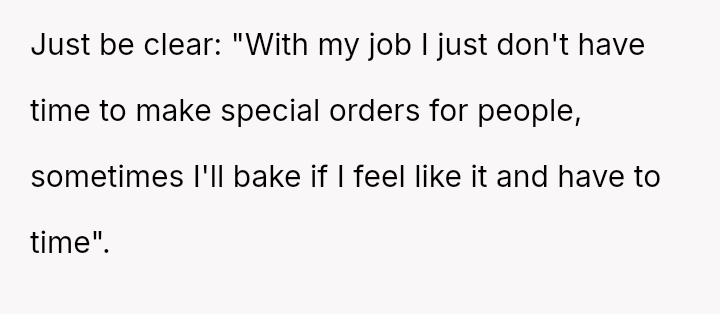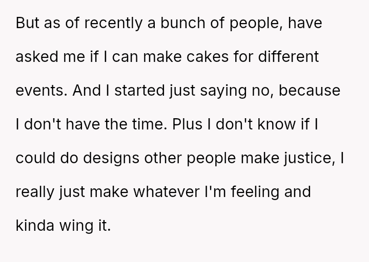 The original poster (OP) enjoys baking as a hobby but has recently faced pressure from friends and family to provide custom cakes for events, which conflicts with their professional time constraints and desire to keep baking low-pressure.