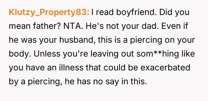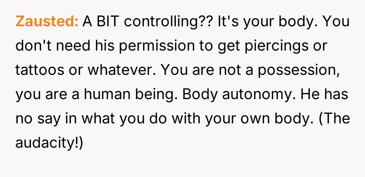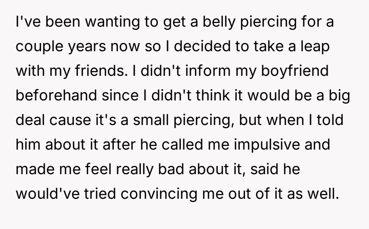 The original poster (OP) is facing conflict because she made a personal decision about body modification (getting a belly piercing) without consulting her boyfriend, leading him to label her as impulsive and attempt to control her future choices.