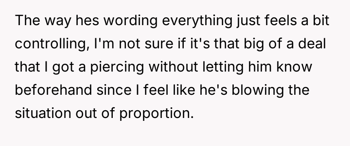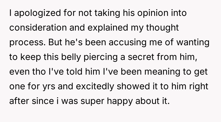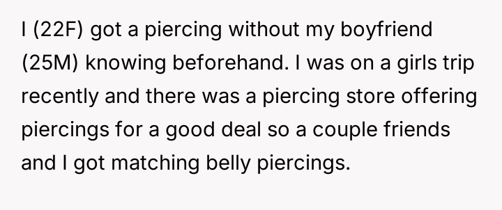 AITA for getting a belly piercing without discussing it with my boyfriend beforehand?