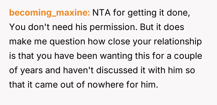 While the OP feels her action was minor and driven by a long-held desire, her boyfriend's reaction indicates a significant difference in expectations regarding shared decision-making and autonomy within the relationship.