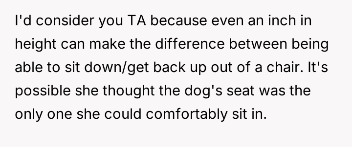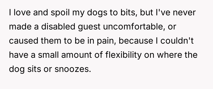 Was the OP justified in protecting their dog's designated resting spot, given the dog's physical limitations, even if it meant denying a convenience to a visiting cousin who also required accessible seating?