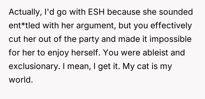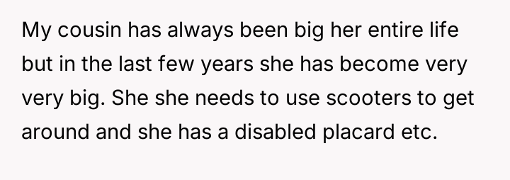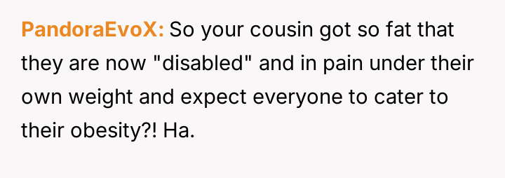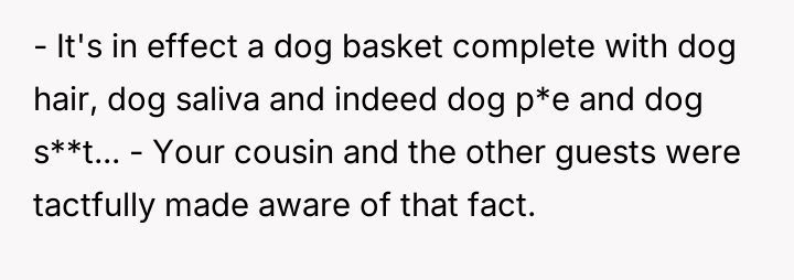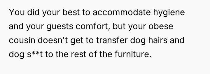 This created a direct conflict between the OP's commitment to their pet's well-being and their cousin's demand for that specific, wide seating arrangement.