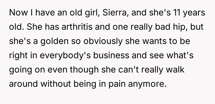 Sierra's worn body tells a story of time and struggle, yet her spirit remains fierce, yearning to be part of the family’s joyous chaos.