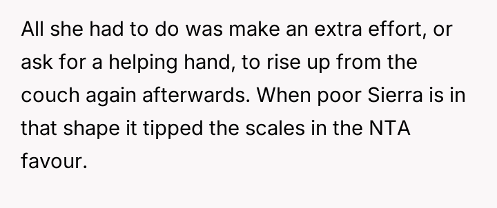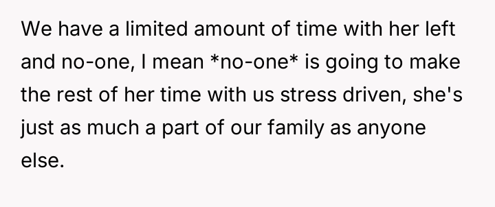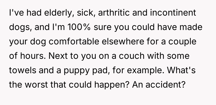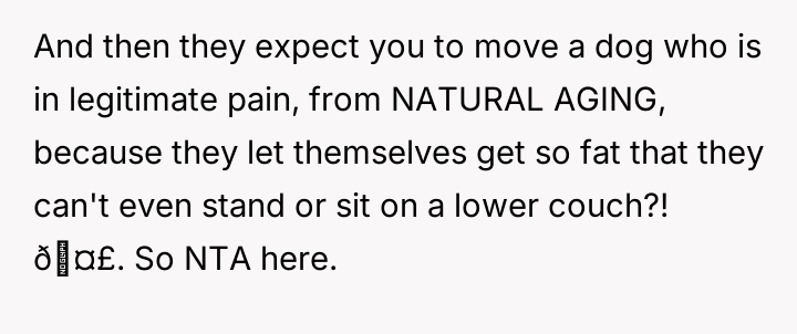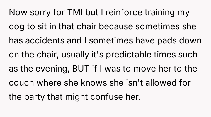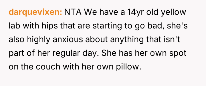The original poster prioritized the comfort and specific needs of their elderly, arthritic dog, Sierra, by refusing to move her from her designated armchair, even when faced with significant family pressure.