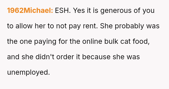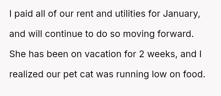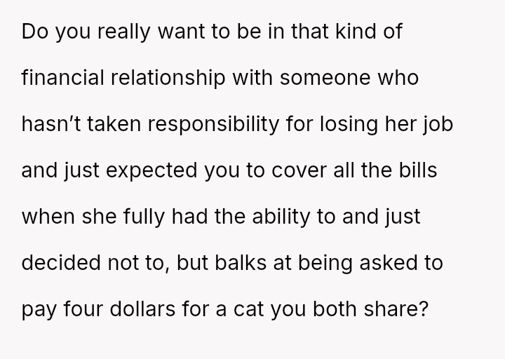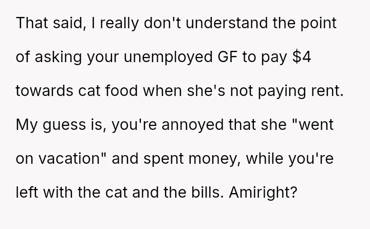 The original poster (OP) is experiencing significant frustration because his girlfriend, who recently lost her job, is refusing to contribute a very small amount toward a shared expense (cat food) while he covers the entirety of their substantial monthly rent and utilities.