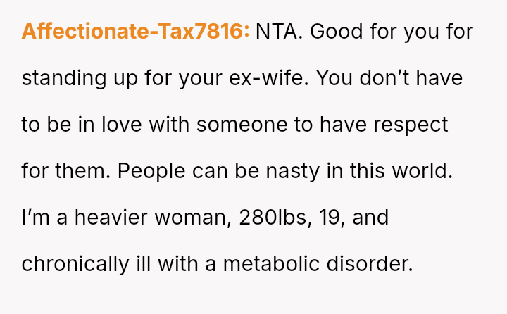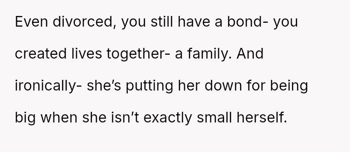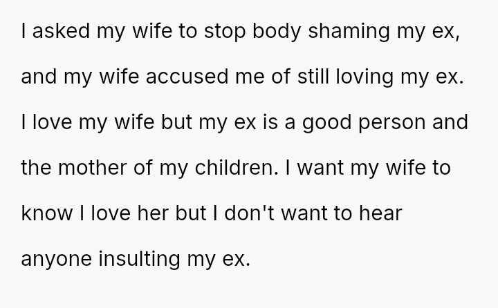 When the OP asked his wife to stop this body shaming, she reacted by accusing him of still being in love with his ex-wife, leading the OP to question if his insistence on protecting his ex from insults while affirming his love for his current wife makes him the a*shole.