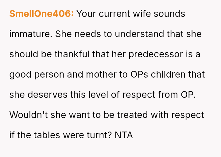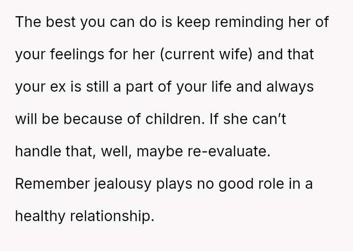 The central conflict revolves around the OP's desire to maintain respect for his ex-wife, who is the mother of his children, while simultaneously rea*suring his current wife of his love and commitment.
