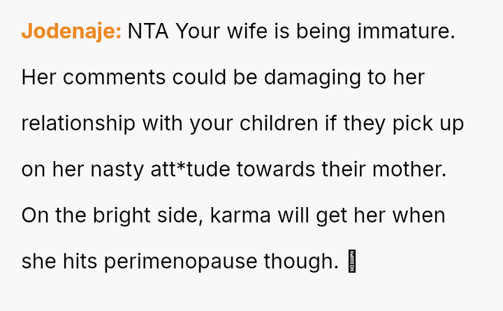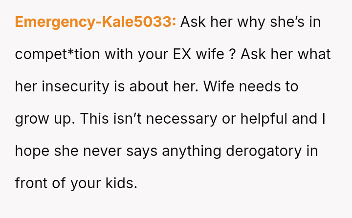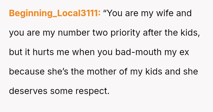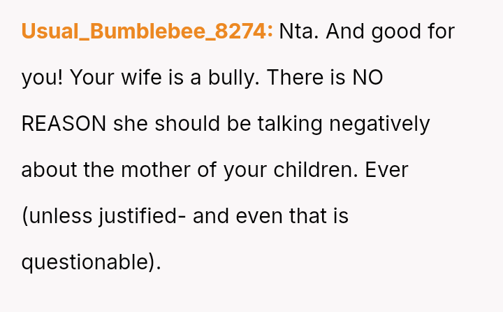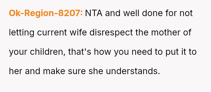 Should the OP prioritize protecting the ex from derogatory language, or should he have focused solely on validating his current wife's feelings and ignoring the insults directed externally?
