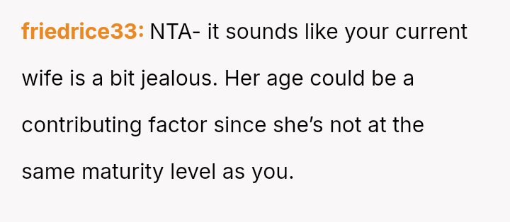 The original poster (OP), a 45-year-old man, is currently married to his second wife, aged 29. This marriage took place a few years after his divorce from his first wife, aged 47.
