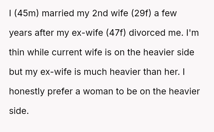 The OP notes a difference in physical appearance between the two women, stating he is thin while his current wife is heavier, and his ex-wife is heavier than both of them, though he personally prefers a partner to be on the heavier side.