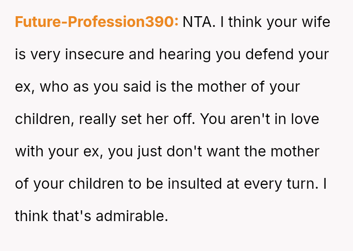 The OP feels caught between defending a non-present party from insults and managing his current wife's insecurity, which manifests as an accusation that defending the ex implies lingering romantic feelings.