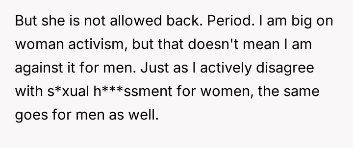 The OP is struggling with cognitive dissonance, as their protective actions contradict their strong personal values as a women's activist.