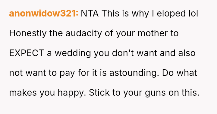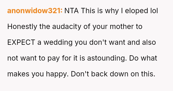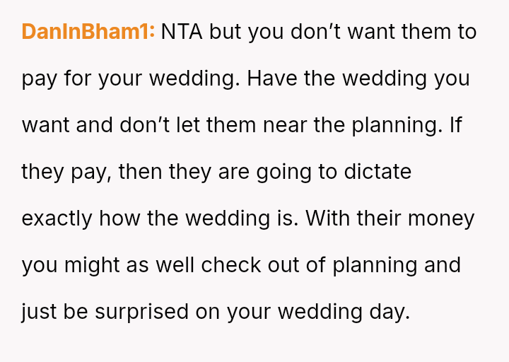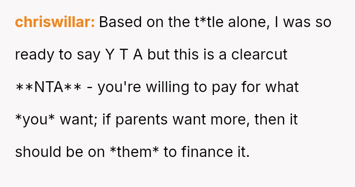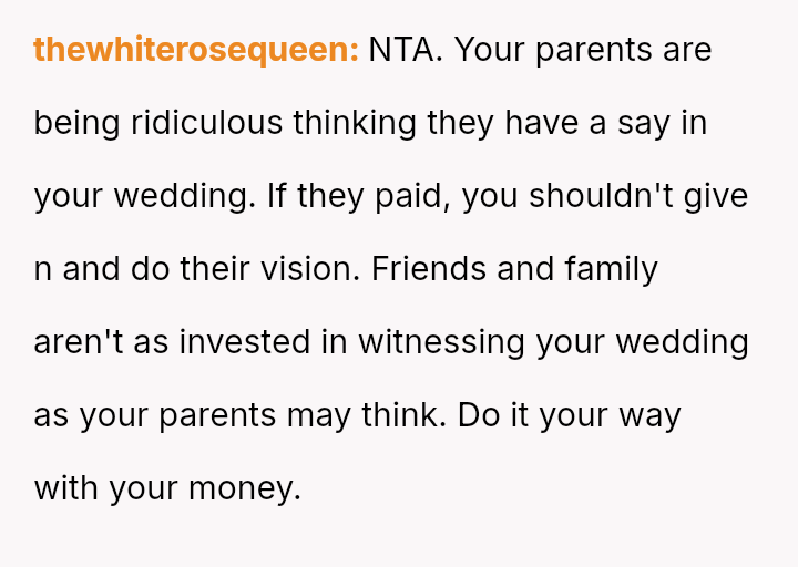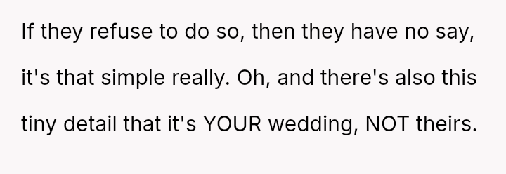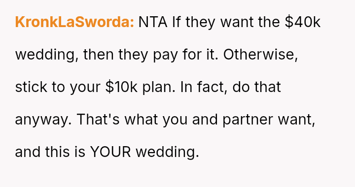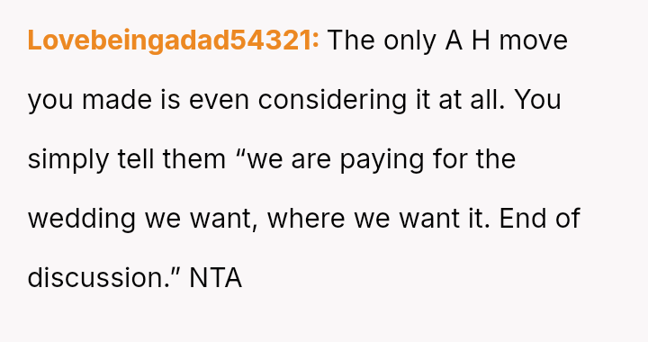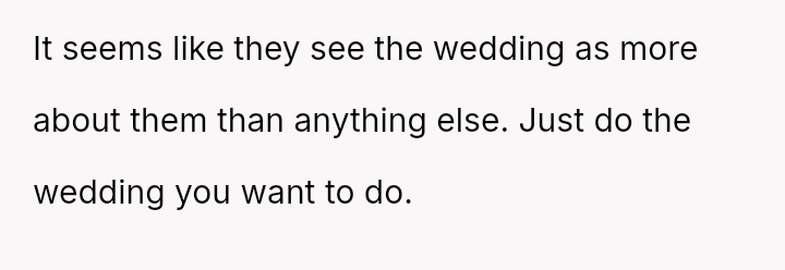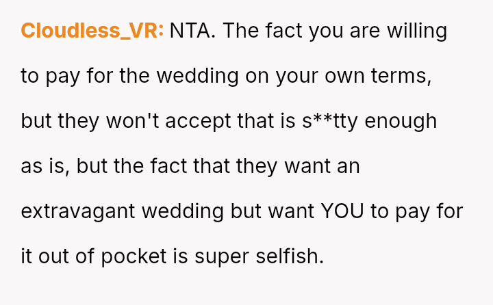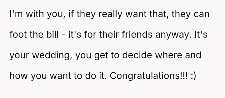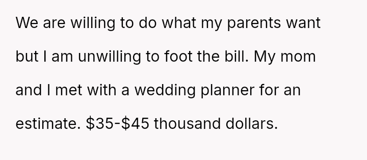 While the OP and her fiancé are willing to compromise on the type of wedding, they are firm that the financial burden of the parents' preferred option should rest with them, given their ability to afford it.