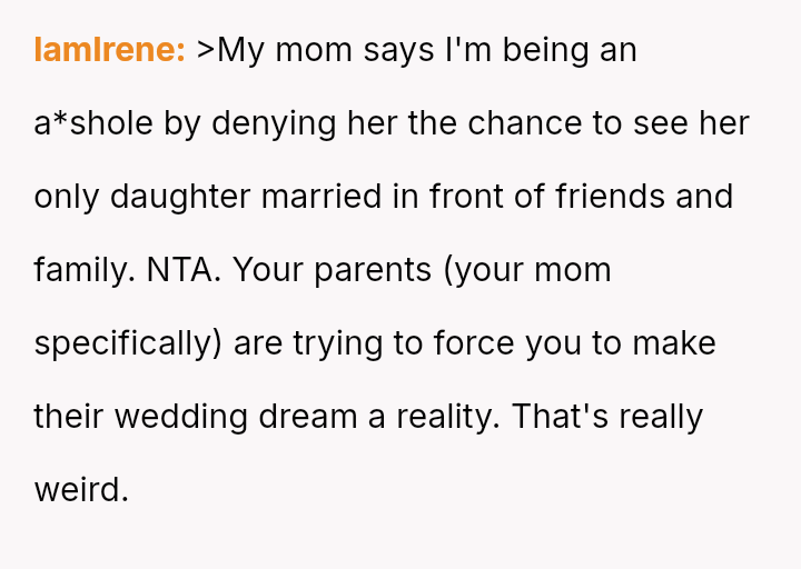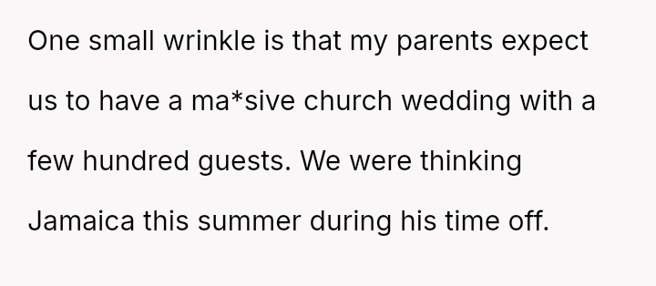 The original poster (OP) is facing a significant conflict between her desire for a modest destination wedding and her parents' strong expectation for a large, expensive church ceremony to satisfy their social standing.