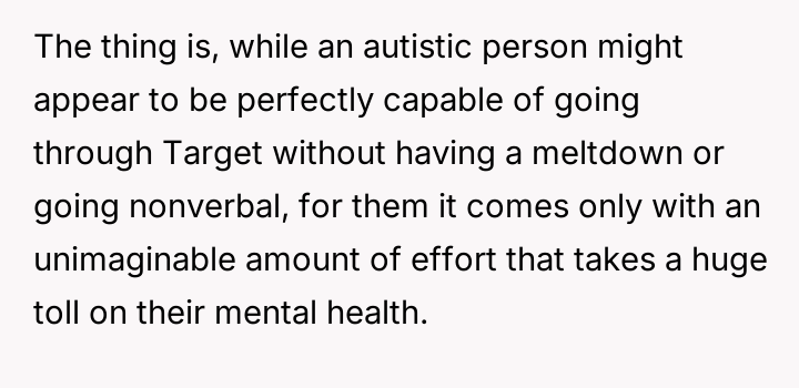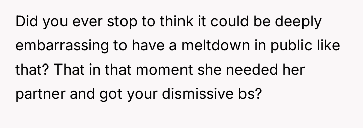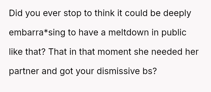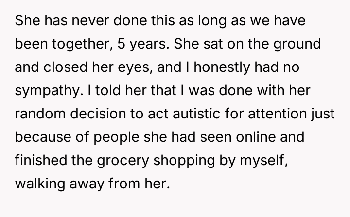 He feels her actions, especially the public display at Target, are attention-seeking or mocking, leading him to abandon her when she became distressed.