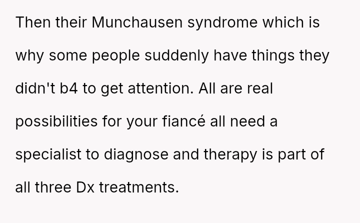 The central conflict is between the OP's perception that his fiancé is faking symptoms for validation and her potential genuine distress, whether self-diagnosed or otherwise.