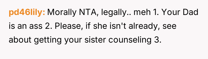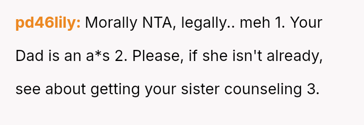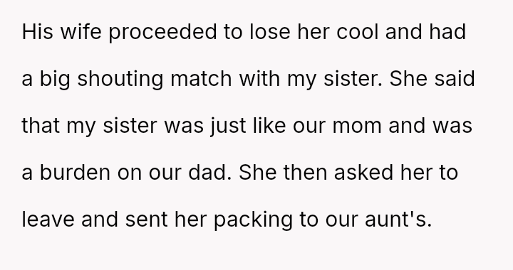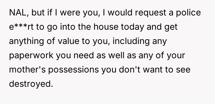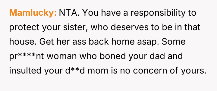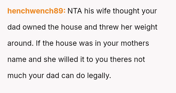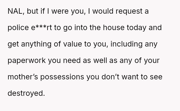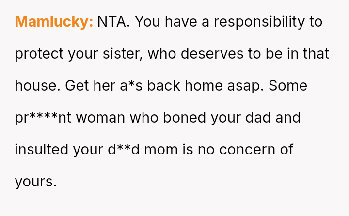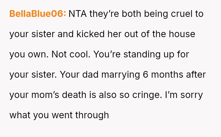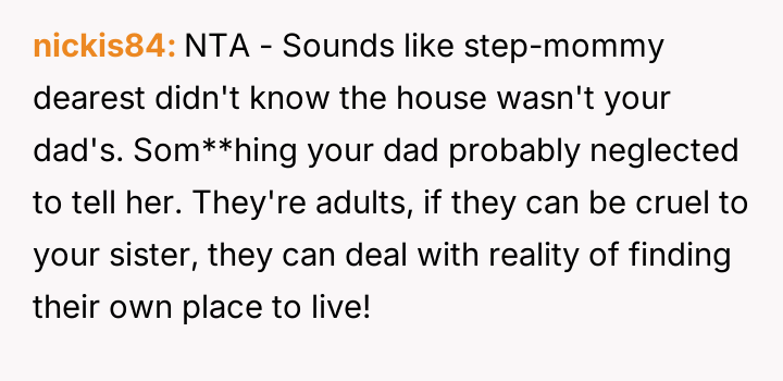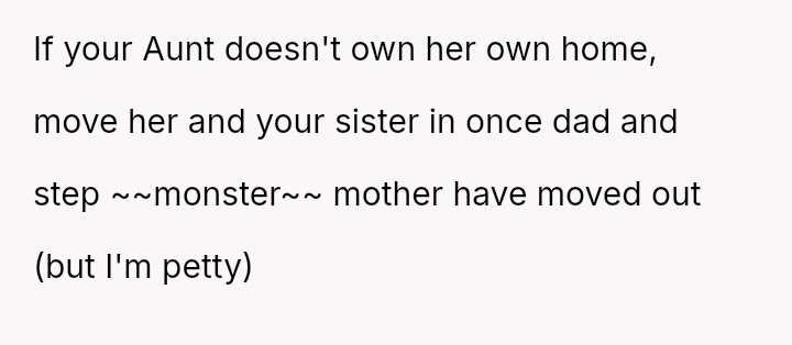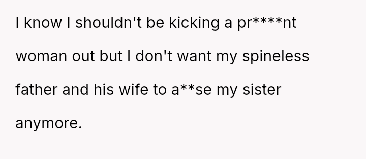 Is the OP justified in immediately demanding that their pr****nt stepmother and father vacate the inherited family home to stop the emotional a**se directed at the sister, or does the severity of an eviction against a heavily pr****nt individual outweigh the immediate need to protect the sister from further emotional distress?