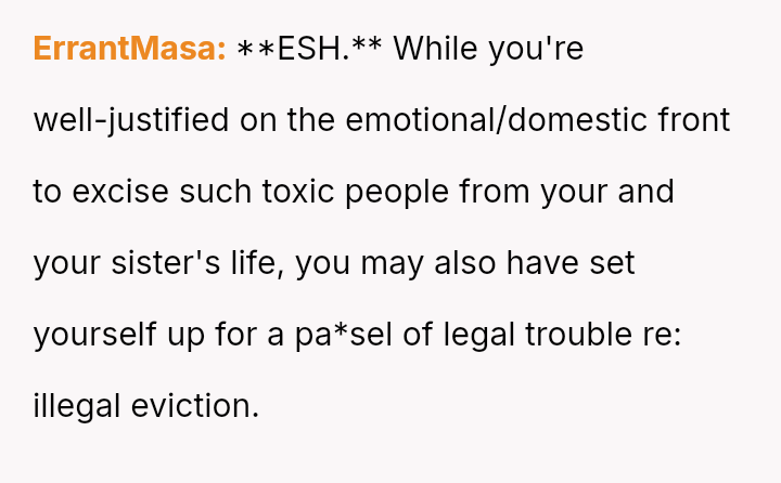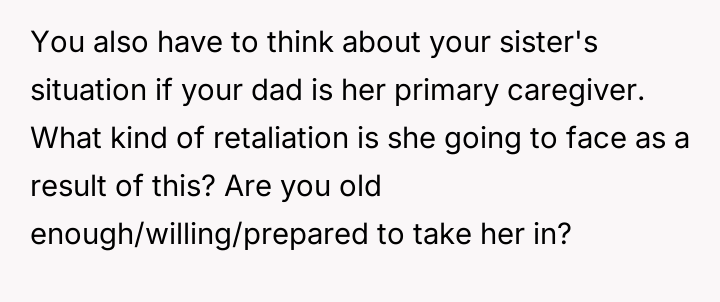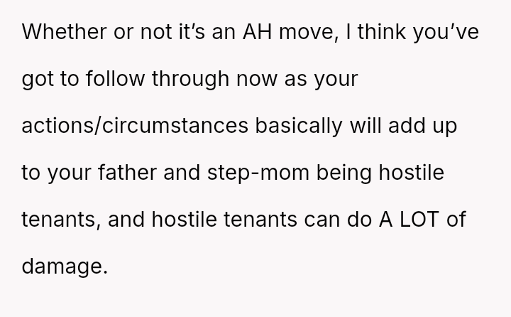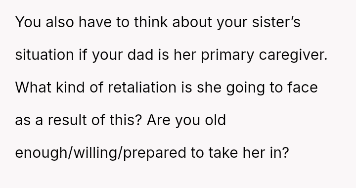 The original poster (OP) is deeply conflicted, acting decisively to protect their younger sister from perceived mistreatment by their father and stepmother, despite the harsh consequences involved, such as issuing an eviction notice to a heavily pr****nt stepmother.