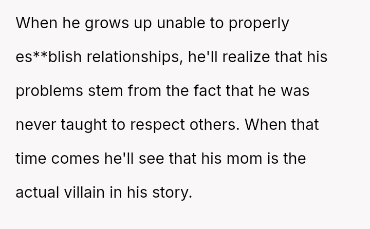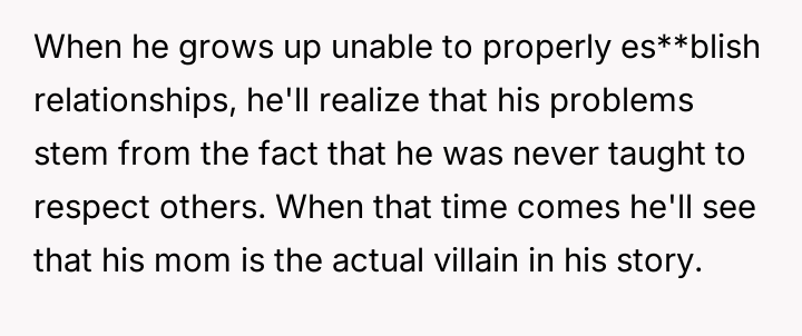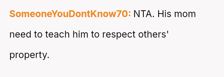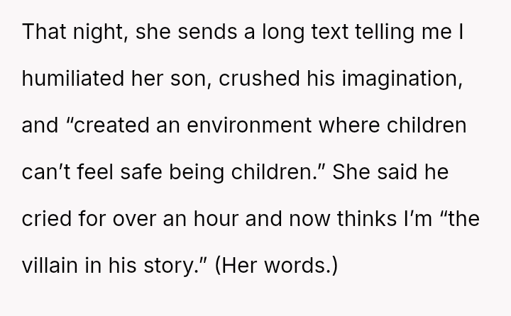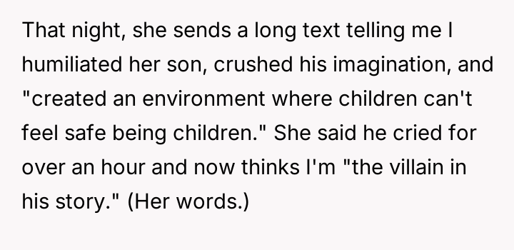 The central conflict arises because the mother prioritized her son's imaginative play and emotional state over respecting the OP's property rights, leading to a defensive confrontation and emotional accusation against the OP.