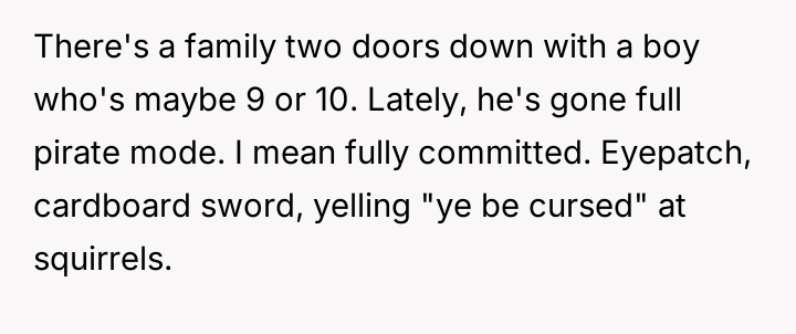 Beneath the calm surface of trimmed grass and aging trees, a young boy’s vivid imagination transforms the mundane into a realm of pirates and hidden treasures, blurring the lines between childhood fantasy and the everyday world.