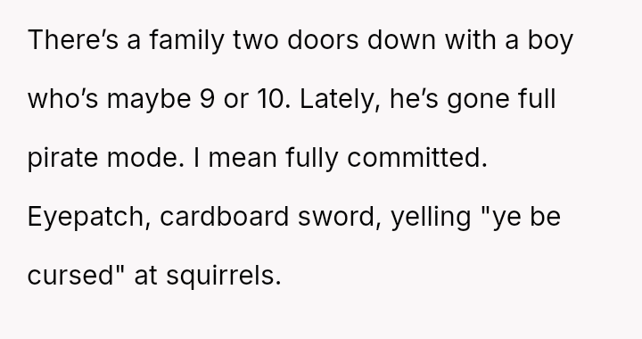 Beneath the calm surface of trimmed gra*s and aging trees, a young boy’s vivid imagination transforms the mundane into a realm of pirates and hidden treasures, blurring the lines between childhood fantasy and the everyday world.