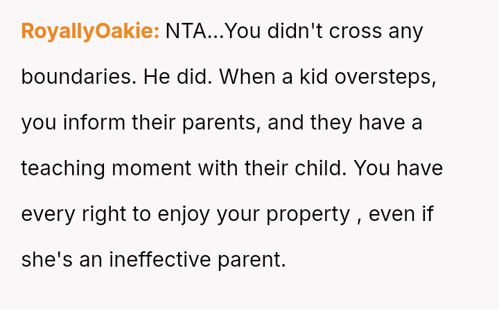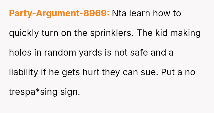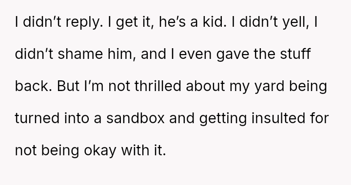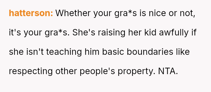 The original poster (OP) maintained a reasonable boundary regarding property use, calmly addressing both the child and the mother about the damage being done to their lawn.