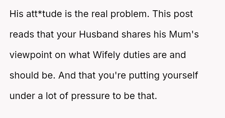 A wife, exhausted and strained, battles not only the weight of her husband's injury but the cold distance of his mother, whose presence casts a shadow over her every move.