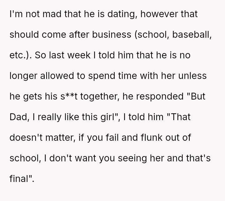 Should a parent prioritize immediate relationship restrictions to enforce academic standards, even if it results in severe conflict and alienates the teenager, or is there a more effective way to mentor a developing young man through balancing personal life with serious responsibilities?