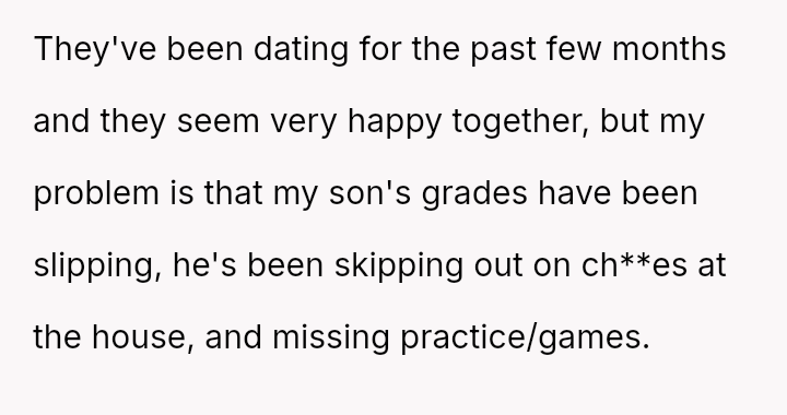 The father is deeply concerned about his son's declining academic performance and missed commitments, viewing the new relationship as the primary distraction that threatens the son's future success.